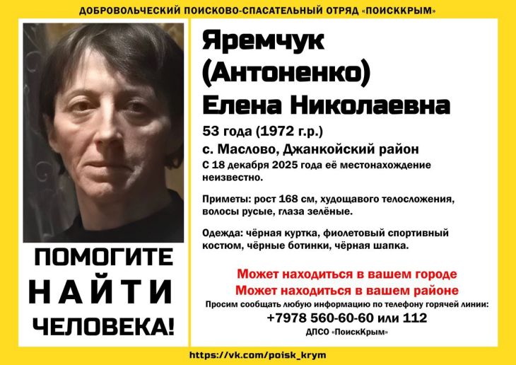 С 18 декабря 2025 года разыскивается жительница села Маслово Джанкойского района Елена Аремчук (Антоненко). 53-летняя женщина в...