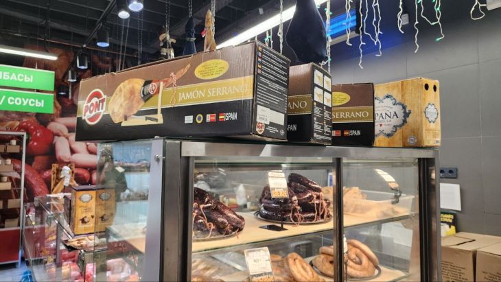 Товары иностранного производства, выявленные в реализации в магазине «Магистраль»: готовая молочная продукция (сыр в ассортименте) - 12,8 кг, готовая мясная продукция (хамон) - 104,2 кг, готовая мясная продукция (колбаса в ассортименте) - 12,9 кг.
