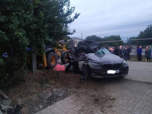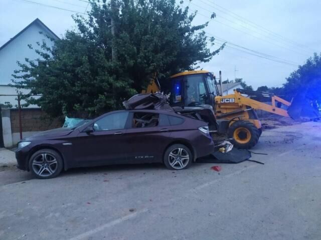 BMW на большой скорости столкнулось с экскаватором, который находился на обочине.