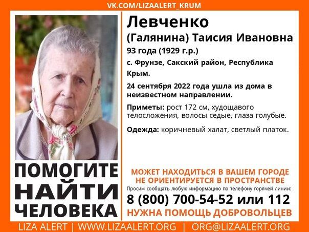 Сегодня, 24 сентября, в селе Фрунзе Сакского района без вести пропала Левченко (Галянина) Таисия Ивановна 1929 года рождения. Об этом сообщили в пресс-службе поискового отряда «ЛизаАлерт Крым».