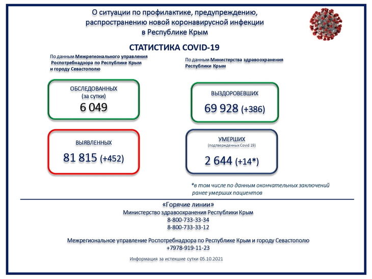 По данным Межрегионального управления Роспотребнадзора по Республике Крым и городу Севастополю за 5 октября 2021 года на территории Республики Крым зарегистрировано 452 случая новой коронавирусной инфекции, всего выявлено 81 815 положительных на Covid-19.