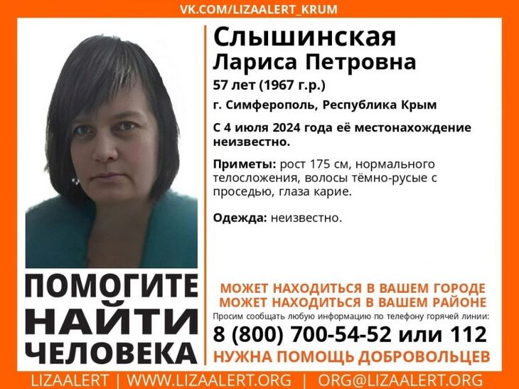 С 4 июля о местонахождении Ларисы Слышинской из Симферополя неизвестно. Об этом сообщил поисково-спасательный отряд «ЛизаАлерт».
