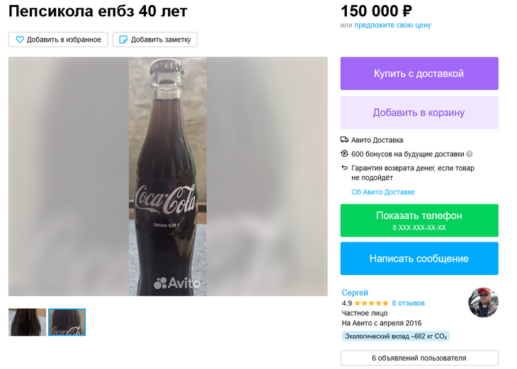 Бутылку «кока-колы из первой партии выпуска Евпаторийского пивобезалкогольного завода» житель Крыма выставил на продажу за 150 тысяч рублей. Объявление с соответствующим лотом крымчанин разместил на одном из популярных сайтов.