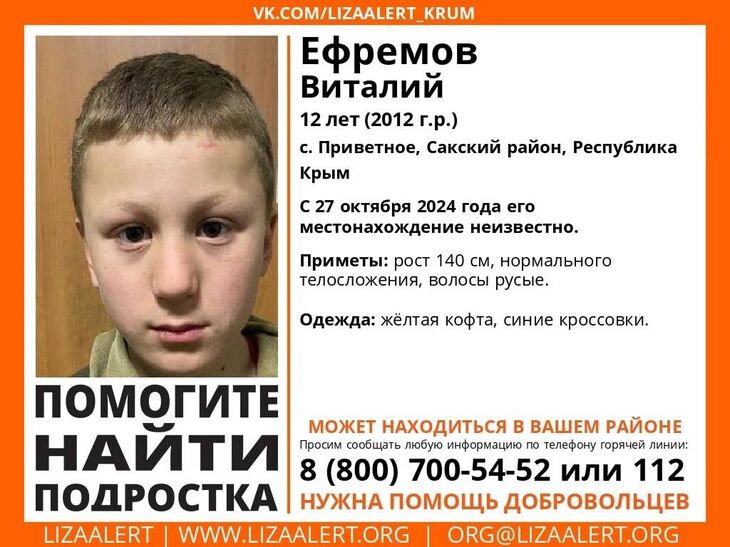 Местонахождение 12-летнего Ефремова Виталия неизвестно с 27 октября. Ребенок пропал в селе Приветное Сакского района. Об этом сообщили в поисково-спасательном отряде «ЛизаАлерт».