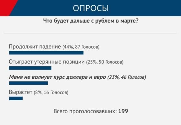 Опрос, проведенный на сайте «Крымского информационного агентства», показал: почти половина жителей полуострова считает, что у российской валюты нет шансов вырасти в марте.