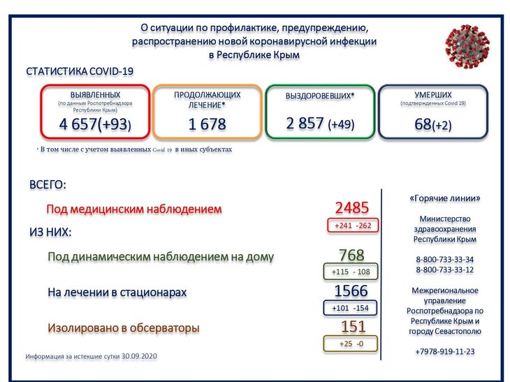 Межрегиональным управлением Роспотребнадзора по Республике Крым и городу Севастополю всего выявлено 4657 положительных на Covid-19. Лечение в медицинских учреждениях Республики Крым проходят 1678 человек, выписано с выздоровлением — 2857.