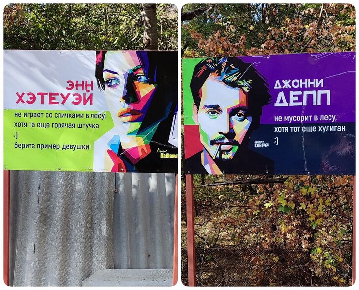 На них изображены известные кинозвезды Джонни Дэпп и Энн Хэтеуэй, они призывают не мусорить в лесах и не играть со спичками.
