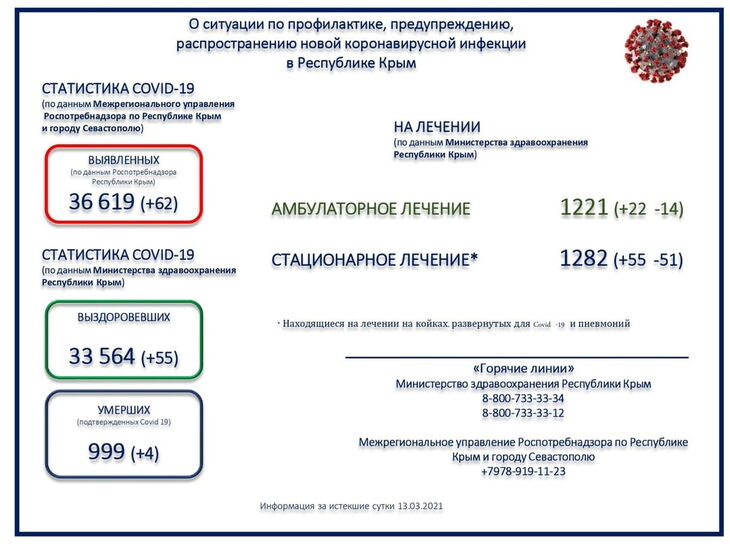 Межрегиональным управлением Роспотребнадзора по Республике Крым и городу Севастополю всего выявлено 36619 положительных на Covid-19. Выписано с выздоровлением — 33564.