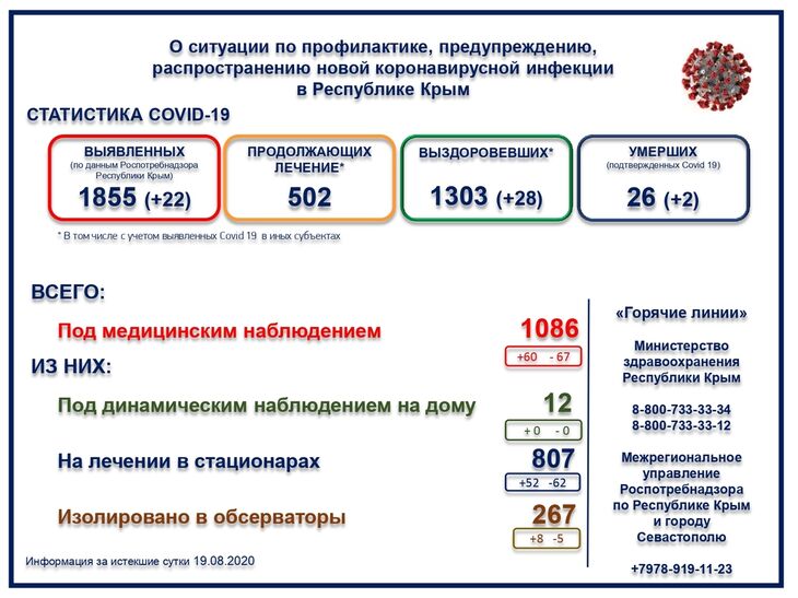Межрегиональным управлением Роспотребнадзора по Республике Крым и городу Севастополю всего выявлено 1855 положительных на Covid-19. Лечение в медицинских учреждениях Республики Крым проходят 502 человека, выписано с выздоровлением — 1303.