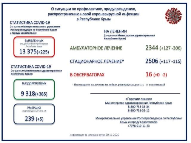 Межрегиональным управлением Роспотребнадзора по Республике Крым и городу Севастополю всего выявлено 13375 положительных на Covid-19. Выписано с выздоровлением — 9318.