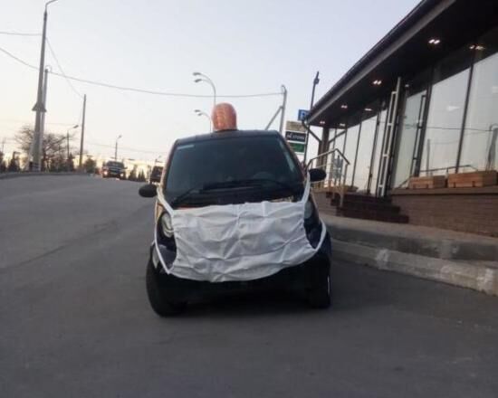 В Севастополе на улице Колобова замечена машина службы доставки суши в большой маске, практически закрывающей капот. Фото машины очевидцы опубликовали в соцсети.