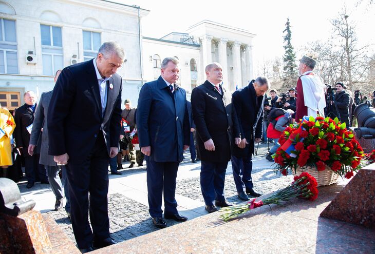 Глава Республики Крым Сергей Аксёнов возложил цветы к памятнику «Народному ополчению всех времен» в рамках памятных мероприятий к 6-й годовщине Общекрымского референдума 2014 года и воссоединения Крыма с Россией.