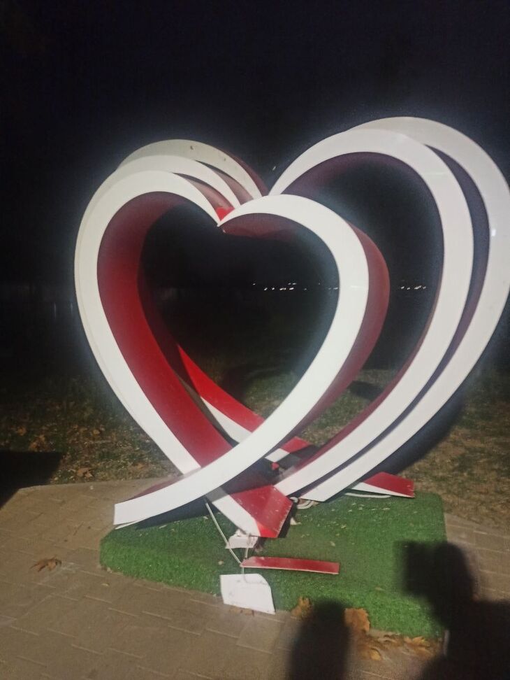 В Саках молодые люди катаясь на старой зеленой «Ауди», решили разнообразить свой досуг и сломали фотозону в форме сердца.
