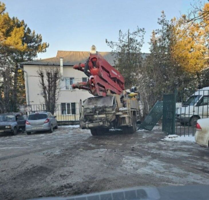 Жители села Доброе Симферопольского района в соцсетях сообщают о ДТП, в результате которого бетононасос въехал в забор местной школы. Фото:...