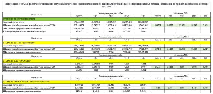 Информация об объеме фактического полезного отпуска электрической энергии и мощности по тарифным группам в разрезе территориальных сетевых организаций по уровням напряжения, в октябре 2025 года