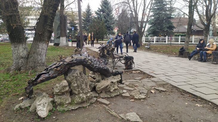 Справка: парк кованых фигур появился в сквере им. Дыбенко (второе название – сквер им. 200-летия Симферополя) в 2007 году. Авторами большинства кованых композиций стали мастера Союза кузнецов Крыма. В парке установлены фигура монаха, лесовик, гигантские башмаки, пушка, дракон, рожденный из пламени, мотоцикл с крыльями, пылающее влюбленное сердце, «Дерево дружбы» и многие другие.