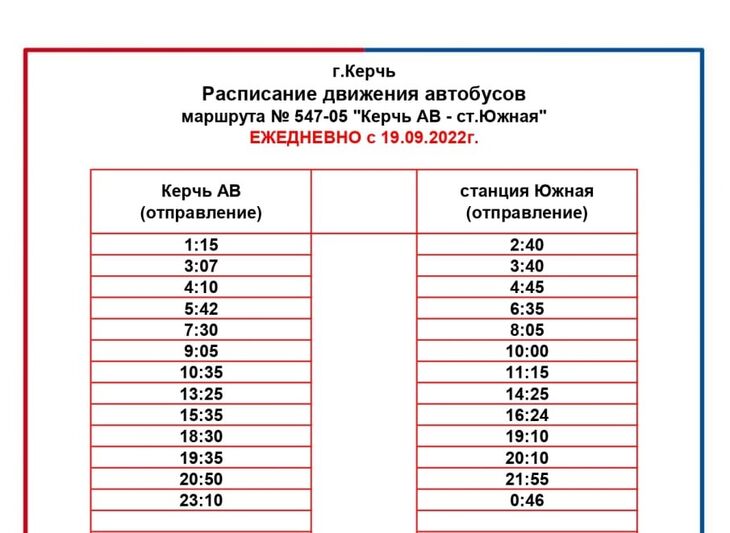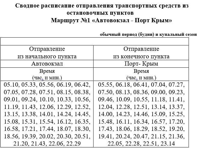 Курсируют автобусы по маршрутам № 1 «Автовокзал — Порт Крым» и № 547-05 «Керчь АВ — ст. Южная» по следующему расписанию: