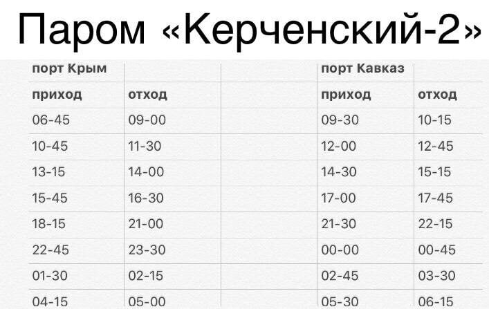 «Паром «Керченский -2» вместимостью 61 пассажир и 15 а/машин «Газель». Приходит в порт «Крым» в 6:45, отправление в 9:00. Время в пути полчаса, ожидание в порту «Кавказ» 45 минут. Следовательно, из порта «Кавказ» паром отправляется в 10:15. И далее по расписанию», — сообщили в пресс-службе.