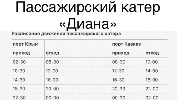 Пассажирский катер «Диана», вместимостью 150 пассажиров, отправляется из порта «Крым» в 8:00, из порта «Кавказ» в 10:00. Время пути -30 минут. Катер следует согласно расписания.