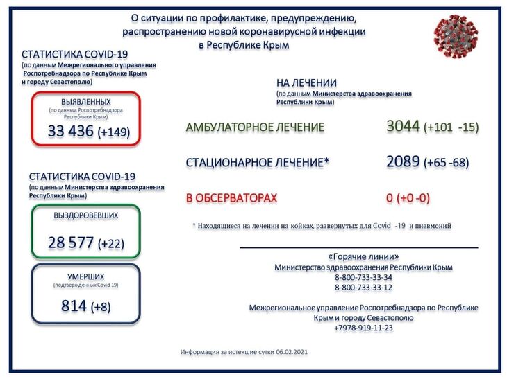 Межрегиональным управлением Роспотребнадзора по Республике Крым и городу Севастополю всего выявлено 33436 положительных на Covid-19. Выписано с выздоровлением — 28577.