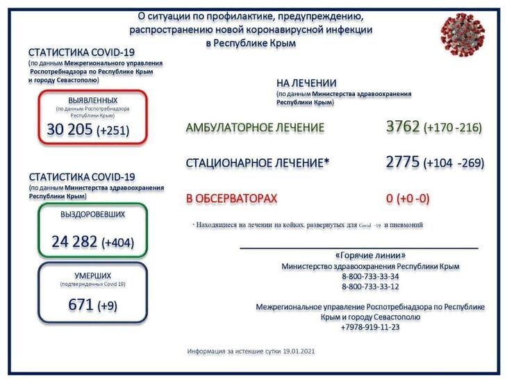 Межрегиональным управлением Роспотребнадзора по Республике Крым и городу Севастополю всего выявлено 30205 положительных на Covid-19. Выписано с выздоровлением — 24282.