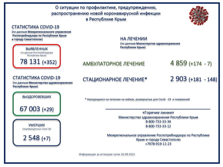Межрегиональным управлением Роспотребнадзора по Республике Крым и городу Севастополю всего выявлено 78131 положительных на Covid-19. Выписано с выздоровлением — 67003.