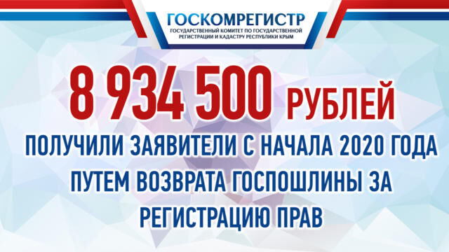 За первый квартал 2020 года юридические и физические лица получили средства на общую сумму 8 934 500 рублей путем возврата государственной пошлины за регистрацию прав. Об этом сообщил председатель Государственного комитета по государственной регистрации и кадастру Республики Крым Александр Спиридонов.