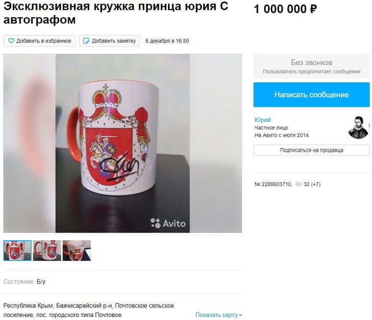 Крымчанин на Авито продает кружку с автографом принца Юрия за 1 000 000 рублей