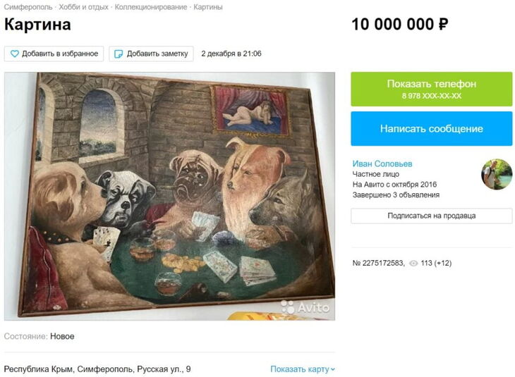 В Симферополе мужчина выставил на продажу копию картины Кассиаса Кулинджа «Собаки играют в покер» и просит за нее 10 млн рублей.