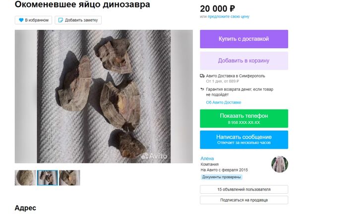 Жительница Севастополя выставила на продажу разбитое окаменевшее яйцо динозавра за 20 тысяч рублей. Соответствующий лот она разместила на одном из сайтов объявлений.