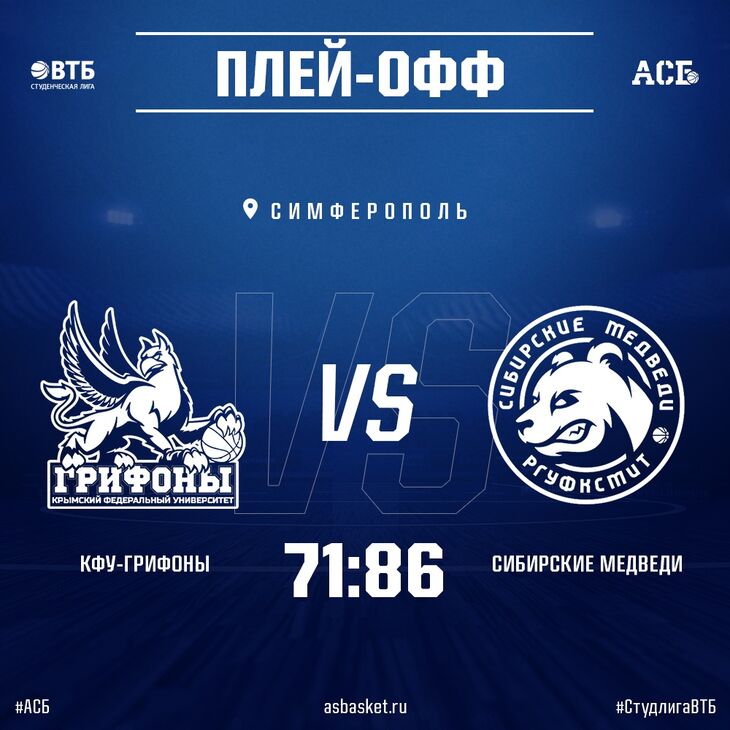 Первый матч команды «КФУ-Грифоны» против «Сибирских медведей» из Иркутска в Симферополе завершился со счётом 71:86 в пользу гостей.