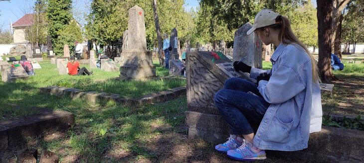 81 студент и 15 преподавателей Крымского художественного училища им. Н.С. Самокиша ухаживают за надгробиями на Военном мемориальном кладбище Симферополя. Художники обновляют надписи на надгробиях и символах памяти.