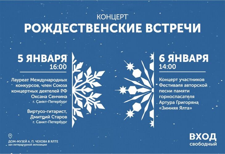 В Доме-музее А. П. Чехова в Ялте 5 января в 16:00 состоится праздничный концерт «Рождественские встречи» с участием Лауреата Международных конкурсов, члена Союза концертных деятелей РФ Оксаны Сенчиной и гитариста-виртуоза Дмитрия Старова. Участники Фестиваля авторской песни памяти горноспасателя Артура Григоряна «Зимняя Ялта» исполнят свои композиции 6 января в 14:00. Вход на концерты свободный.