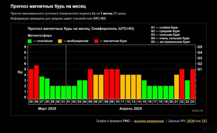 Магнитные бури отступят только на 9 дней. Следующие геомагнитные возмущения ожидаются 5 апреля, затем метеозависимых ожидает двухдневная передышка и магнитные бури ударят по Крыму снова. Прогнозируются бури уровня G1.