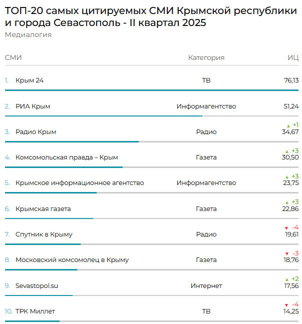 Крымское информационное агентство поднялось на 5-ю строчку рейтинга самых цитируемых СМИ Республики Крым и Севастополя за второй квартал 2025 года по версии «Медиалогии».