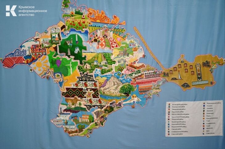 В Симферополе Ко Дню России презентовали проект «Вышитая карта Крыма». Над полотном трудились 55 мастеров, которые вышили 11 городских округ...