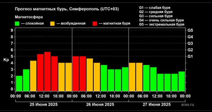 25 июня космическая непогода обрушится на нашу планету около полудня и будет бушевать до 18 часов с разной степенью интенсивности - от уровня G1 до G2. Далее до полуночи геомагнитная обстановка немного стабилизируется, однако магнитосферный фон все еще будет повышен.