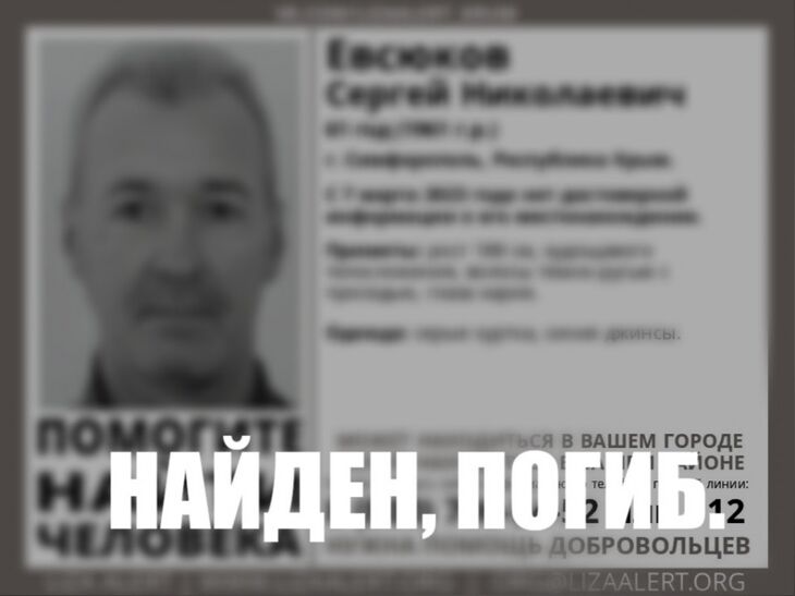 Евсюков Сергей Николаевич без вести пропал в селе Трудолюбовка Бахчисарайского района 7 марта. На его поиски были подключены сотрудники МЧС и «КрымСпас» и участники отряда «ЛизаАлерт Крым».