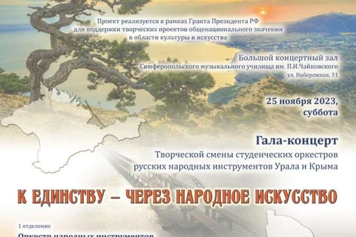 В Концертном зале Симферопольского музыкального училища имени П.И. Чайковского 25 ноября в 17:00 состоится гала-концерт творческой смены студенческих оркестров русских народных инструментов Урала и Крыма «К единству — через народное искусство».