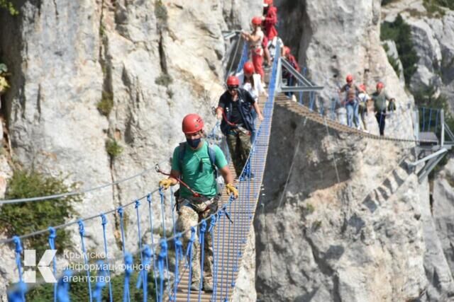 Новый экстремальный туристический маршрут «Небесная тропа» открыли на Ай-Петри. Любители острых впечатлений могут пройти 360 метров по подвесным ступеням и насладиться фантастическим видом на Южный берег Крыма.