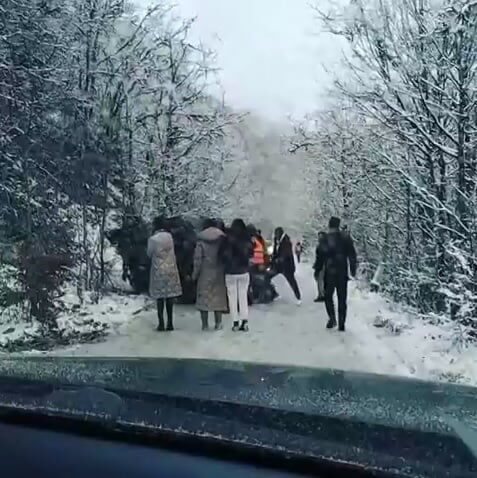 «Помогли девочкам перевернуть машину… Все живы и здоровы, кроме машины. Будьте осторожны на горных дорогах, сейчас очень скользко и уж точно не стоит ехать в горы на летней резине!», — призывает автор видео.