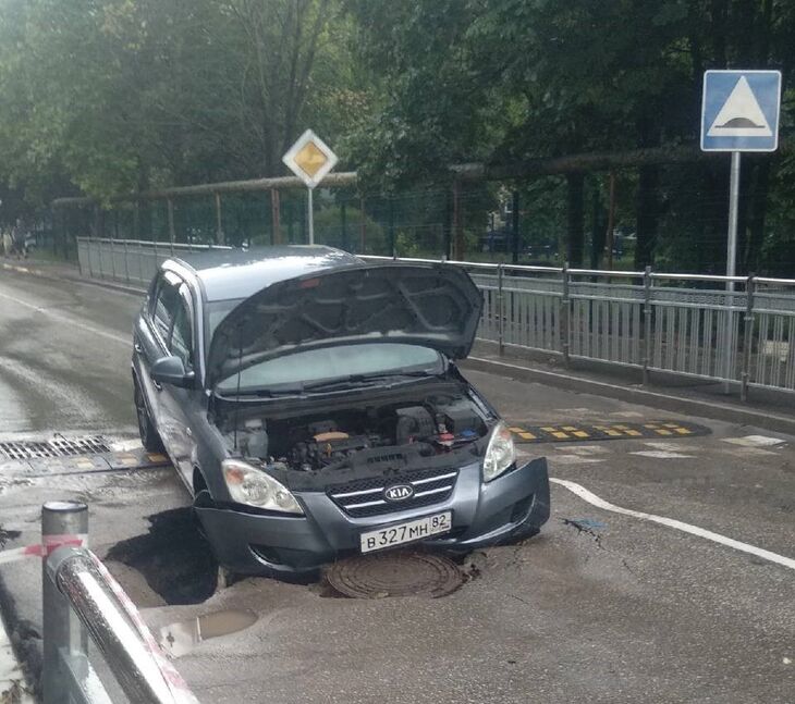 На улице Баррикадная в Симферополе сегодня после дождя провалился асфальт, в образовавшуюся яму угодил автомобиль.