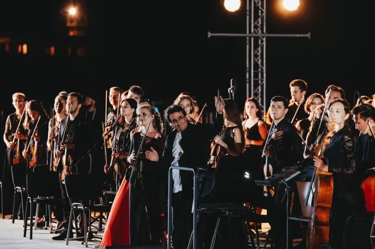 В составе оркестра – 119 инструментов. Закат и строящиеся объекты стали декорациями для шоу, техника – частью сценографии, а диджейские сеты и современная хореография – связующей нитью между брутальностью сценического пространства и одухотворенностью классического искусства.
