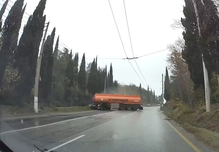 В сеть попали кадры с видео регистратора, на которых видно, как водитель не справился с управлением и бензовоз сделал пару пируэтов вокруг себя. Вероятно, это произошло из-за мокрой дороги — на видео заметен накрапывающий дождь.