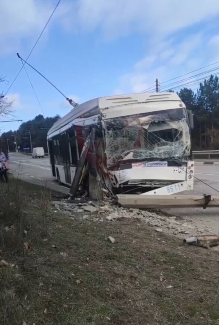 Как стало известно «Крымскому информационному агентству», в районе Алушты, чуть ниже остановки «Артек», троллейбус въехал в столб и сильно повредил лобовое стекло.