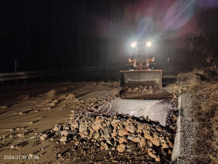 На опубликованных снимках видно, что на часть автомобильной дороги вынесло большое количество камней. Дорожная служба при помощи спецтехники устраняет последствия.
