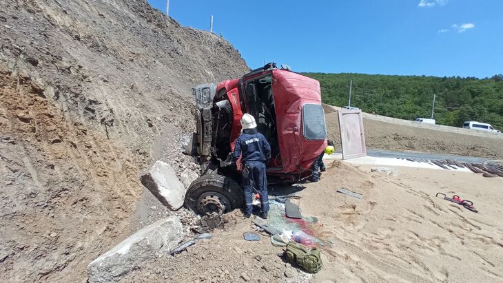 Выяснилось, что «КАМаз» съехал в кювет и перевернулся, вокруг покореженной машины разлилось топливо.
