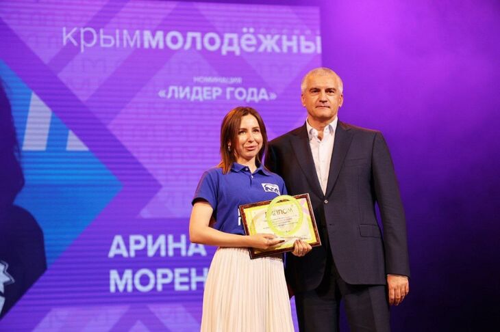 Затем Сергей Аксёнов вручил премию победителю номинации «Лидер года» помощнику ректора по молодежной политике и патриотическому воспитанию ГБОУ ВО РК «Крымский университет культуры, искусств и туризма» Арине Моренец.