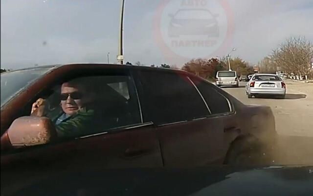 В Крыму мужчина хотел повернуть из второго ряда через сплошную линию, а ехавший рядом водитель решил его проучить и не сбавил скорость. Видео участник происшествия опубликовал в группе автолюбителей Крыма в соцсети «ВКонтакте».
