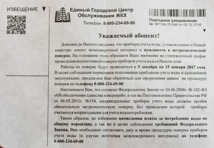 По её словам, информация, указанная в листовках, предназначается в качестве напоминания для тех, у кого межповеречный интервал уже истекает. А компания, рассылающая листовки, занимается консультациями, а также заменой и установкой приборов учета воды.